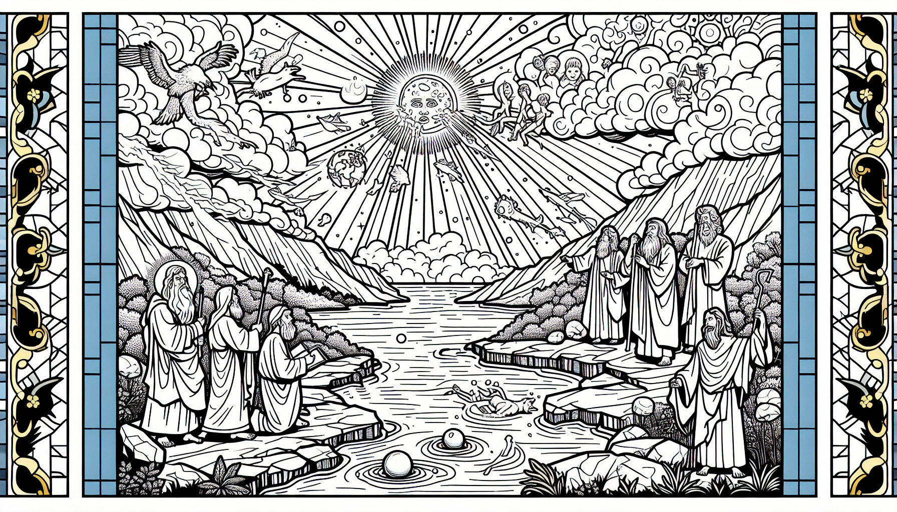 On the fourth day, God thought about time. The world needed markers for days, seasons, and years. So, God gave the world the greatest lights: a bright sun for the day, a gentle moon for the night, and countless twinkling stars to fill the evening sky. "Let these lights in the sky shine down on the earth," God declared. And that’s exactly what happened. The sun bathed the world in warm, golden light, the moon offered a soft, silver glow, and the stars twinkled like tiny, distant lanterns. Each day and night were now marked by these heavenly bodies, and it was all good.